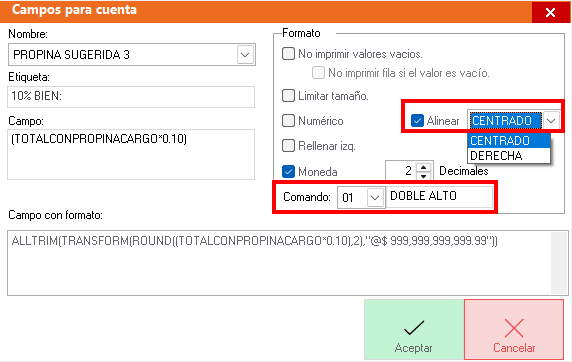 En la misma ventana de AGREGAR CAMPO, puede modificar la alineación y usar algún comando de formato, yo usaré DOBLE ALTO para que sea más visible (opcional), presionar ACEPTAR para finalizar.