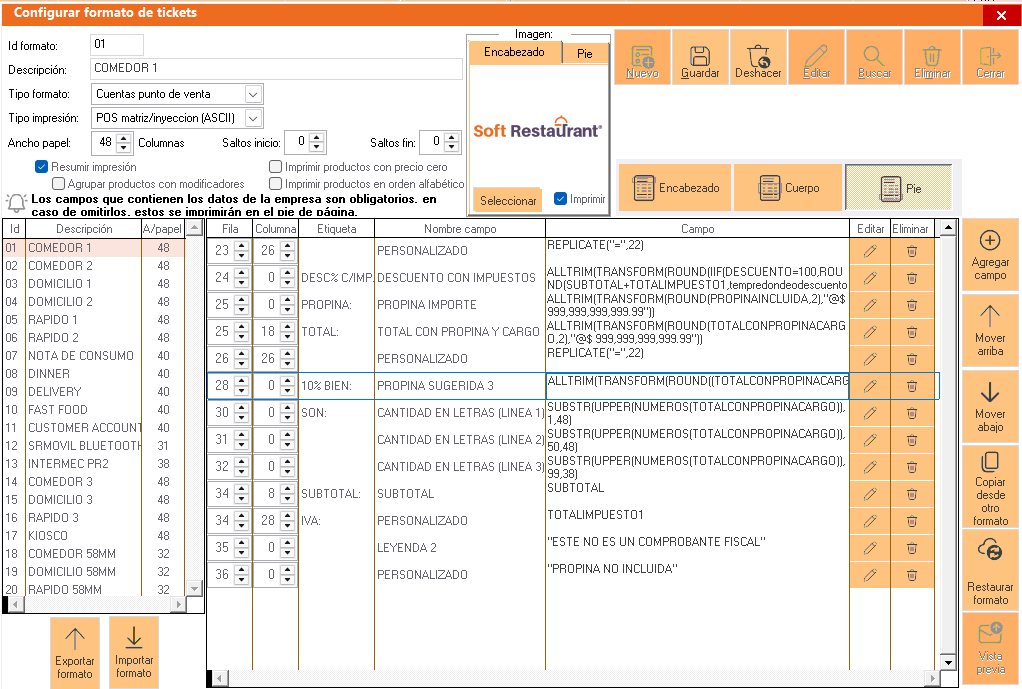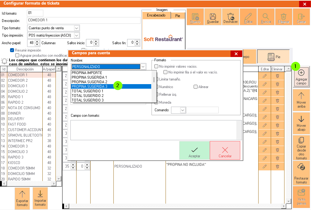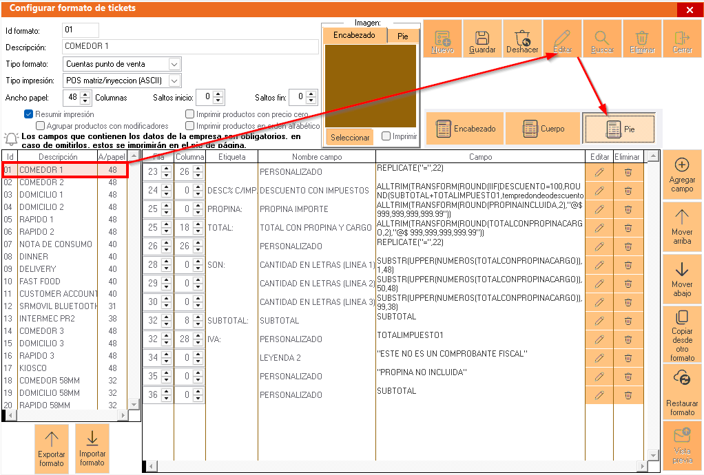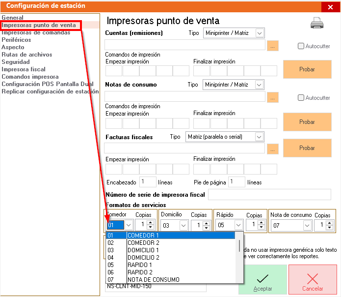 Seleccionar impresoras punto de venta y en la parte inferior en el apartado de formatos de servicios, identificar el formato que está activo, en este caso es el formato 01-COMEDOR1