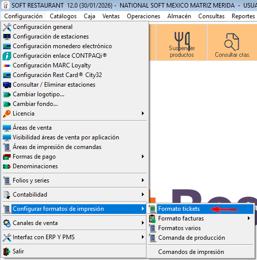 Ir al menú Configuración > Configuración de formatos de impresión > Formato tickets