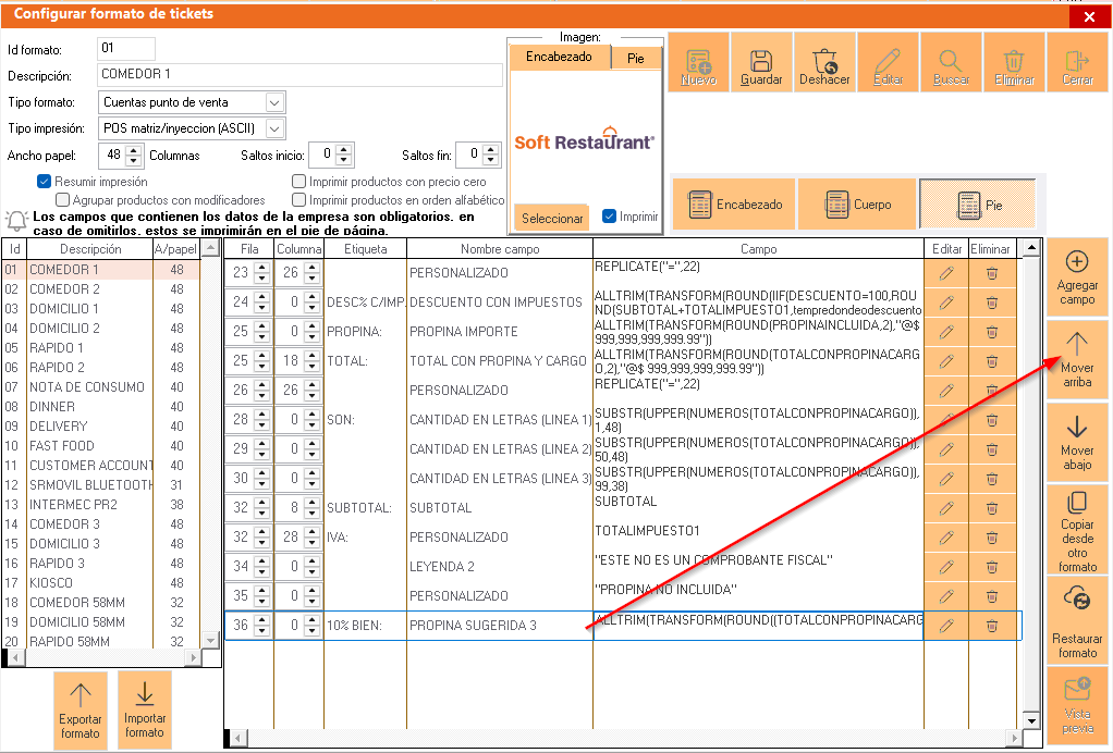 Damos 1 clic sobre el campo agregado y presiono MOVER ARRIBA varias veces para posicionarlo antes de la cantidad con letra (o en el espacio donde lo desee agregar).