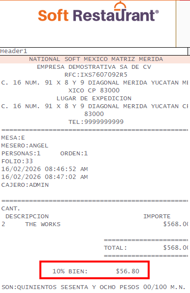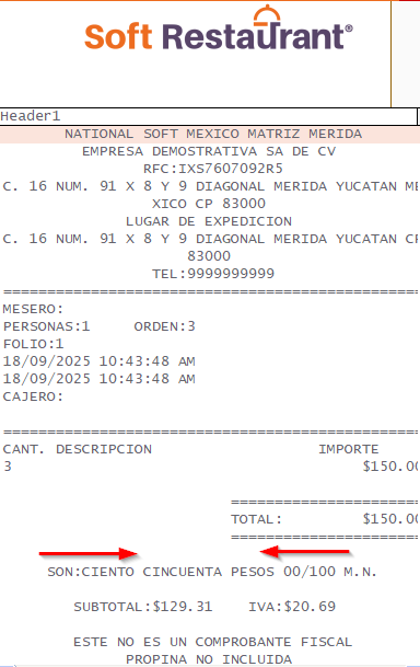 Para el ejemplo, tengo el siguiente ticket, y como ejemplo, ingresaré el campo de propina sugerida en el espacio marcado entre las flechas.