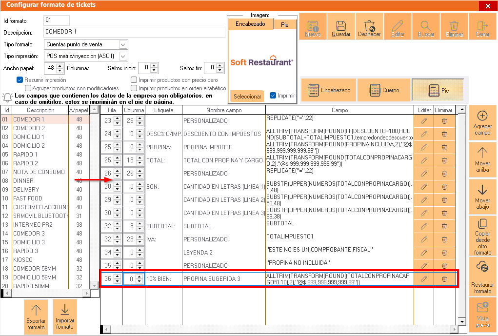 Una vez agregado el campo, este, se posicionará al final de la ventana como podemos ver en la siguiente imagen en la fila 36, pero debemos moverla a la fila donde deseamos que se imprima, en este caso lo quiero mover para posicionarlo antes de la cantidad con letra que comienza en la fila 28.