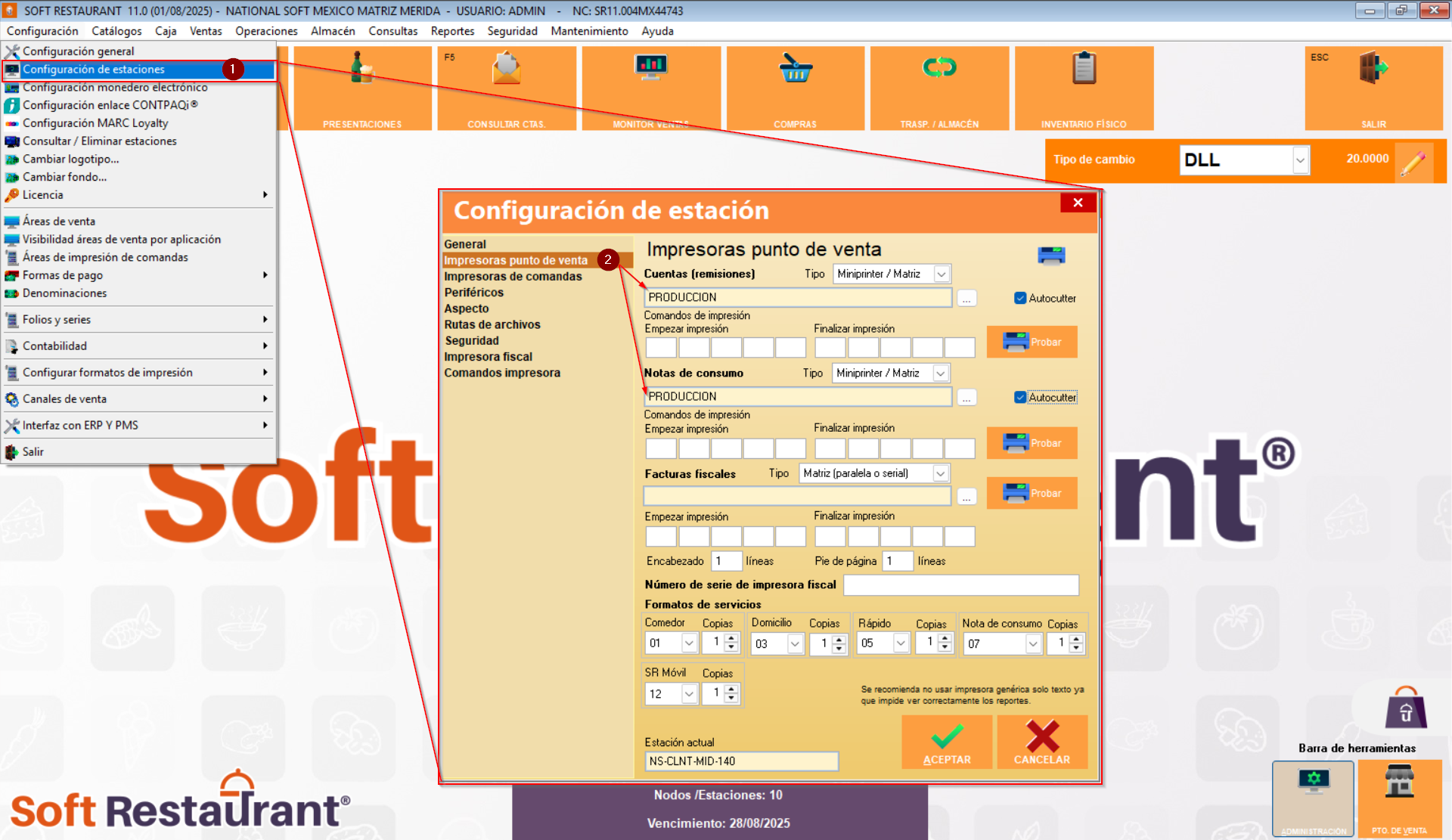 - Verificar el formato de ticket asignado en la estación, esto en "Configuración -> Configuración de Estaciones -> Impresora Punto de Venta -> Formatos de servicios"